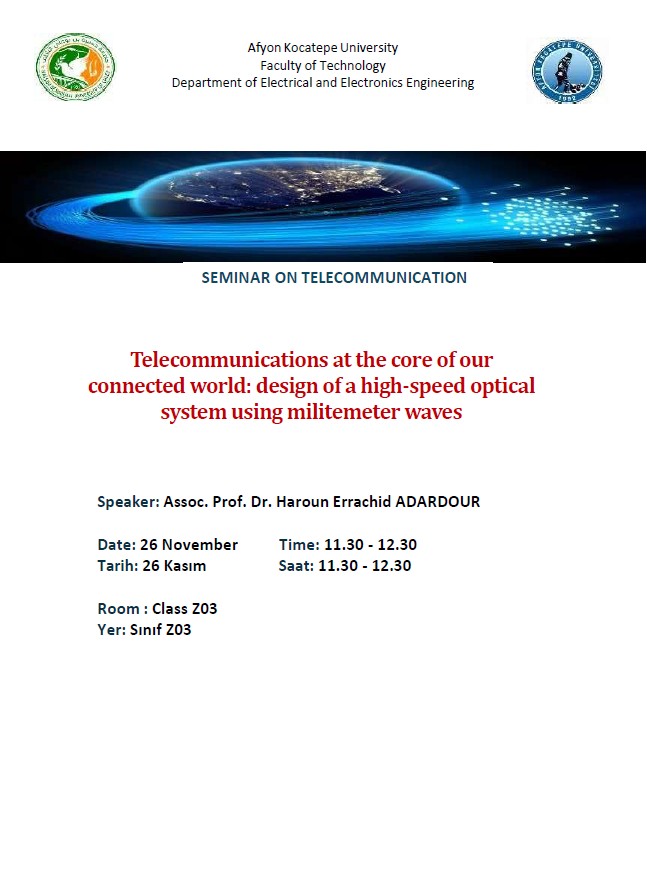 Dr. Haroun Errachid ADARDOUR tarafından 26 Kasım 2025 saat 11.30’da z-03 nolu derslikte gerçekleştirilecek olan “Telecommunications at the core of our connected world: design of a high-speed optical system using militemeter waves” isimli seminere tüm akademik personelimiz ve öğrencilerimiz davetlidir.